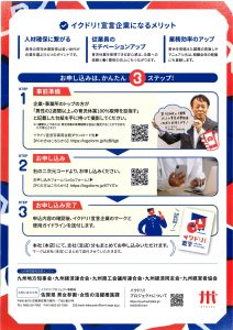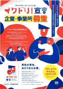 男性の育児休業取得がごく自然なこととなり安心して子育てができる社会全体で子育てをする九州になることを目指し男性の2週間以上の育児休業取得を推進する企業を九州地域戦略会議が認証する制度です。